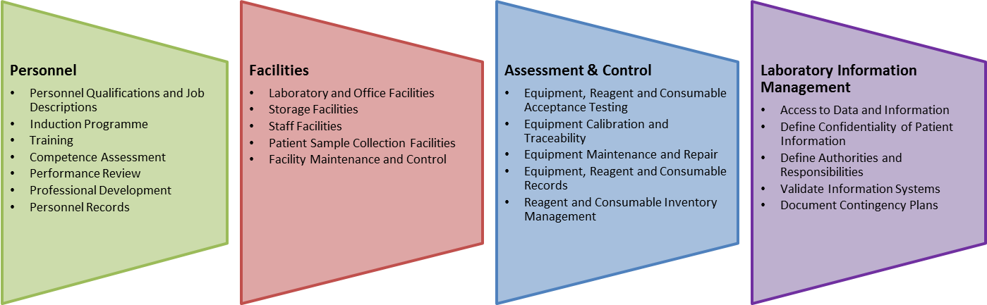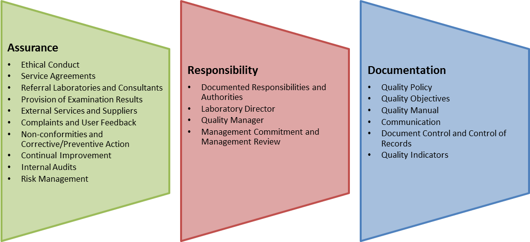 ISO 15189 Medical Laboratories — Particular requirements for quality and competence is a ‘variant’ standard derived from ISO/IEC 17025 with specific focus on clinical laboratories. The standard covers an ‘end-to-end’ approach to the application of quality assurance methodologies in a clinical environment. This range from definition of services offered through to collection of patient samples, sample transport, storage, transportation and test and includes the reporting, interpretation and delivery of test results. The standard also focuses on management responsibilities as well as supporting processes such as facilities, calibration, method validation, training etc.